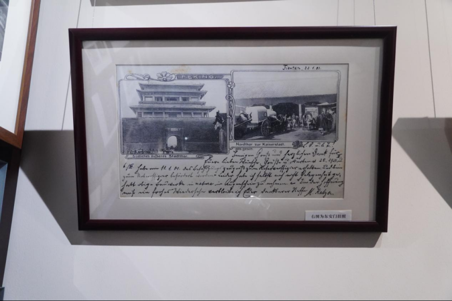 展厅里还有一张东安门的老照片,如果观者不留意,很容易就会错过。李哲说,东安门毁于1912年的战火,现在很少有东安门的正面照,而展出的这张照片,因为呈现了东安门的正面细节而显得格外珍贵。通过东安门右侧的门洞,能看到远处的东安里门。他也正是通过这个细节,确认了这张照片的历史价值。