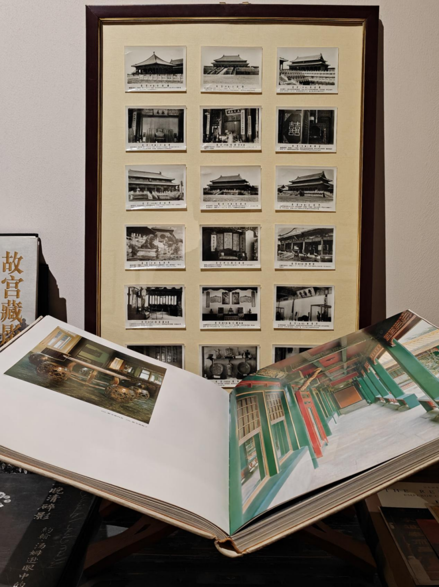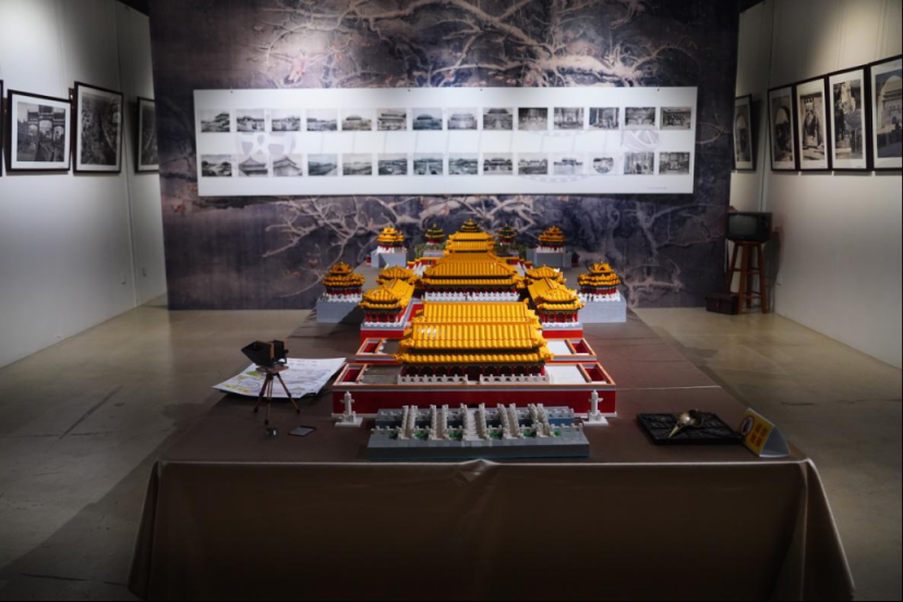 左侧展厅的一面墙上,也挂满了上世纪初外国摄影师拍摄的故宫,历史的风云变幻在眼前定格。在这些老照片前,人们的目光不禁会被一件特殊的装置设计所吸引。这是一套故宫建筑的拼插模型,极高还原度的细节复刻以及金碧辉煌的气质,让展厅的老照片鲜活起来。