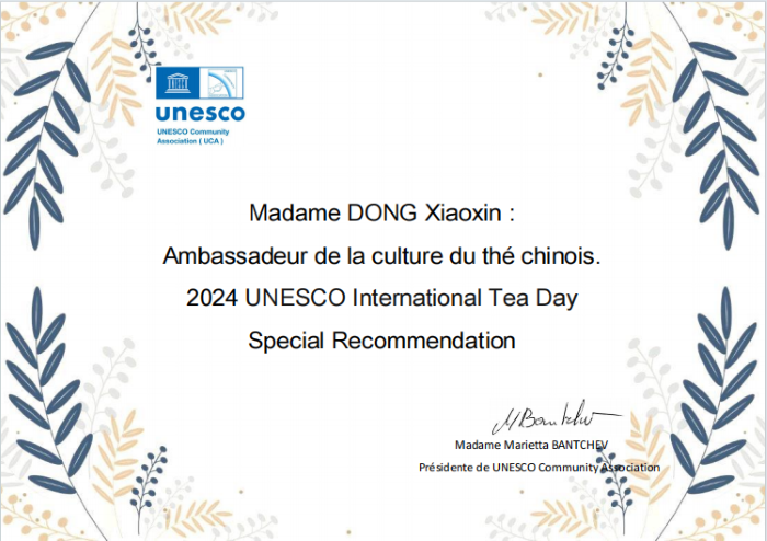 近日,在巴黎举办的“国际茶日”文明对话活动中,中国茶美学与茶科技发展中心主任、《国际会客厅》栏目总制片人董晓欣被联合国教科文组织直属协会(UCA)授予 “中华茶文化大使”称号。