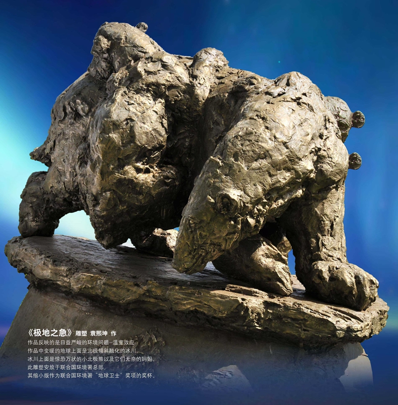 许多年后,已成为艺术大家的袁熙坤依然坚守心中对环保的执着,他被授予联合国首任“环保艺术大师”称号,曾创作《极地之急:北极熊》《森林守护神:虎》《女娲补天》等多个雕塑作品,希望以此唤起人们的环保意识及对濒临物种的关注,他还将创作稿费用于环保公益广告,先后在全国60多个城市的1000多个公交站点做环保公益广告。