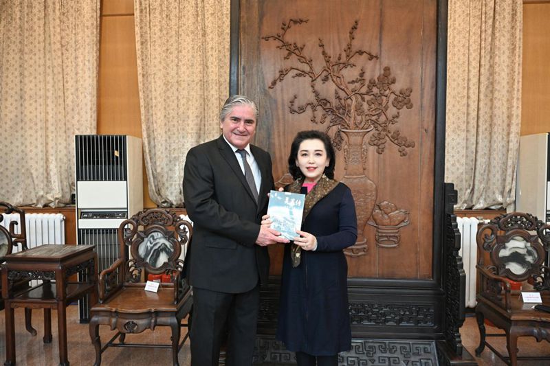 近日,秘鲁驻华大使巴拉雷索与中华茶文化大使、中国茶美学与茶科技发展中心主任董晓欣就茶文化进行交流。图为董晓欣(右)将《灵芽传》一书赠送给巴拉雷索(左)。