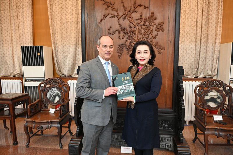 近日,阿根廷驻华大使马致远与中华茶文化大使、中国茶美学与茶科技发展中心主任董晓欣就茶文化进行交流。图为董晓欣(右)将《灵芽传》一书赠送给马致远(左)。