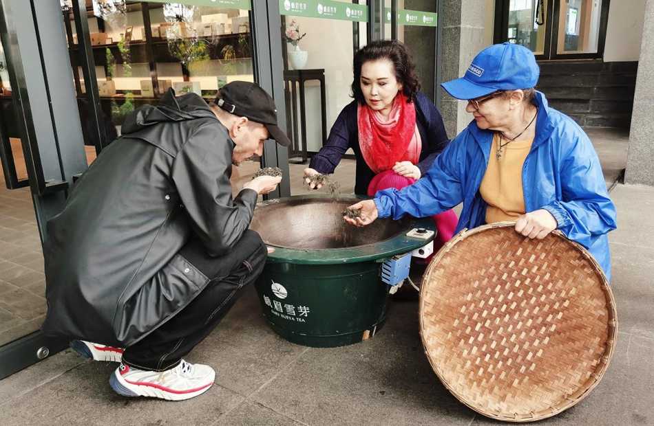 法国茶叶协会会长杰里米·塔门(左一)、中华茶文化大使董晓欣、联合国教科文组织直属协会会长玛赫耶塔(右一)体验制茶工艺。