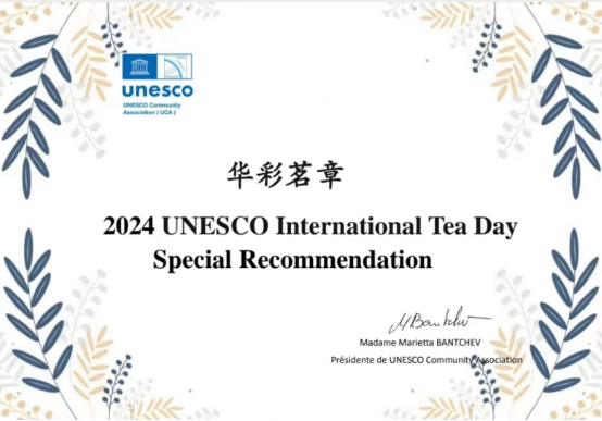 近日,联合国教科文组织在法国巴黎举办“国际茶日”文明对话品茶鉴茶活动。由中国茶美学与茶科技发展中心与勐海凰馨茶业有限公司联合研发的中国茶“华彩茗章”赢得现场嘉宾赞誉,被联合国教科文组织直属协会(UCA)授予“2024联合国教科文组织‘国际茶日’特别推荐”。