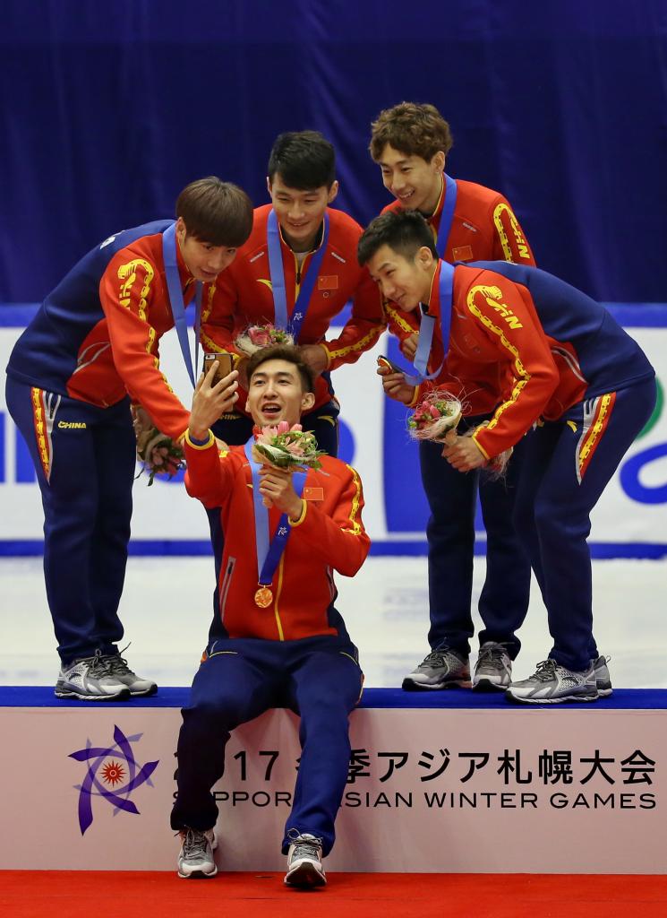 这是2017年2月22日,中国队选手武大靖(前)在第八届亚洲冬季运动会短道速滑男子5000米接力颁奖仪式后与队友自拍留念。中国队夺得冠军。新华社记者 杨世尧 摄