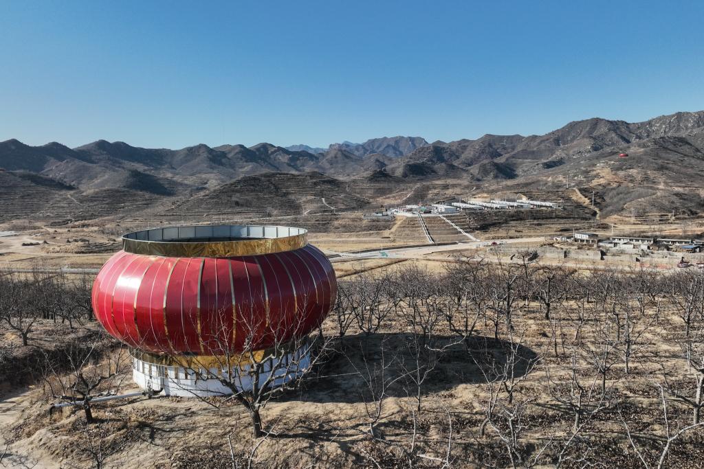 记者发现,附近的十多个山头上,各有一个特大号的“红灯笼”。它们是引水灌溉工程的蓄水“天池”。人们给它们“穿”上红色的彩钢瓦外套,形如红灯笼。“灯笼”周身安装了太阳能灯带,夜幕降临后,“灯笼”亮起来,成为一道独特的风景。