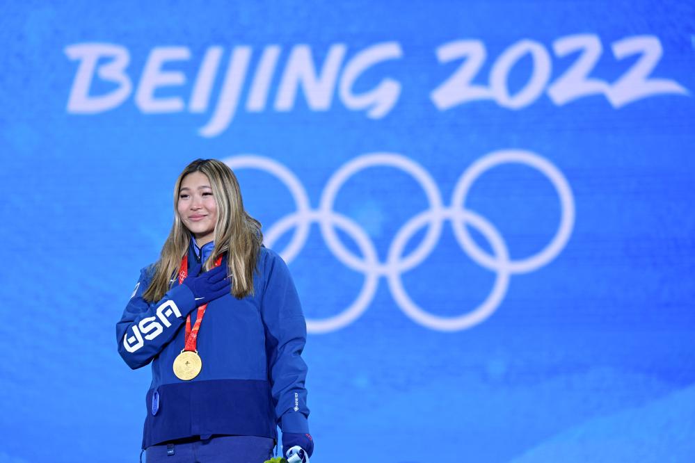 2022年2月10日,冠军美国选手克洛伊·金在北京2022年冬奥会单板滑雪女子U型场地技巧奖牌颁发仪式上。新华社记者 戴天放 摄