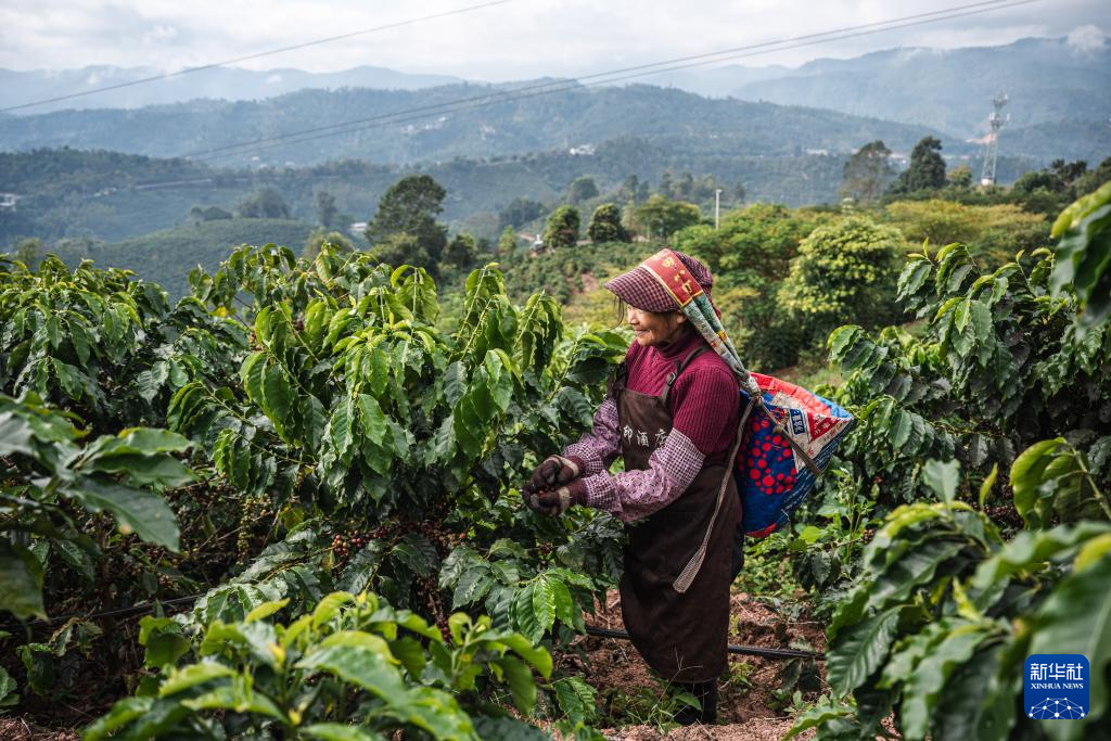 2026年1月23日,咖农在云南省临沧市双江县沙河乡陈家寨村云顶筑巢咖啡庄园采摘咖啡果。新华社记者高咏薇 摄