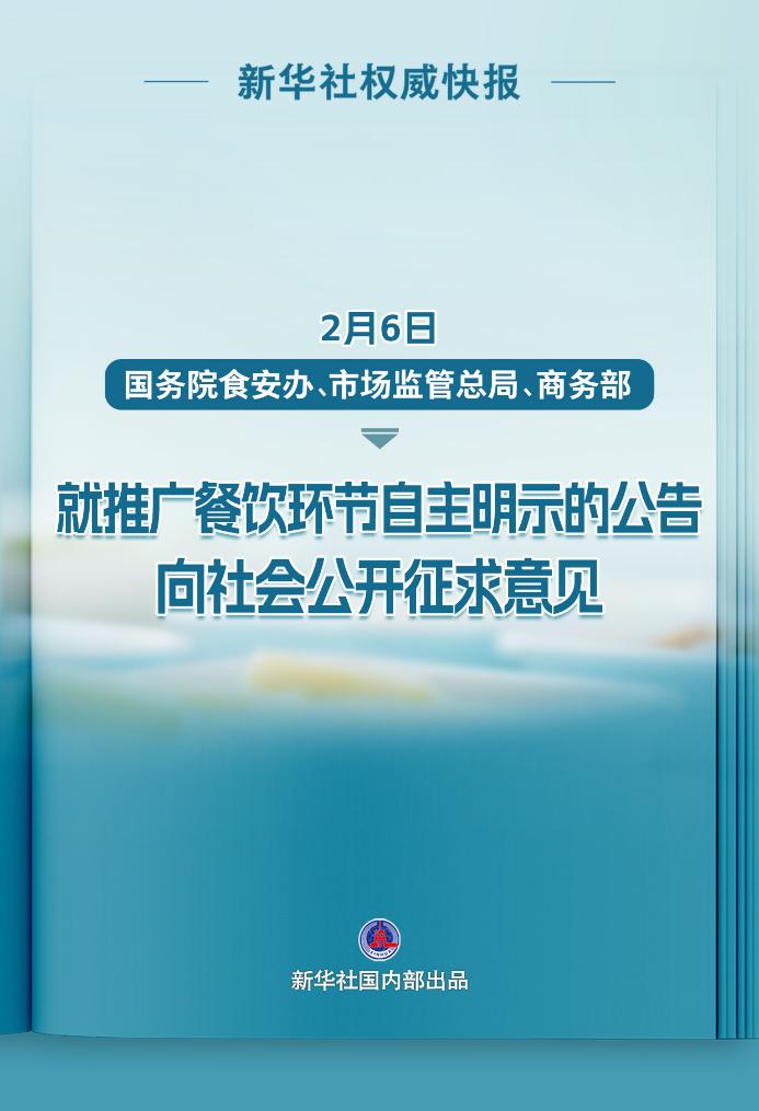 2月6日,国务院食安办、市场监管总局、商务部就推广餐饮环节自主明示的公告向社会公开征求意见。