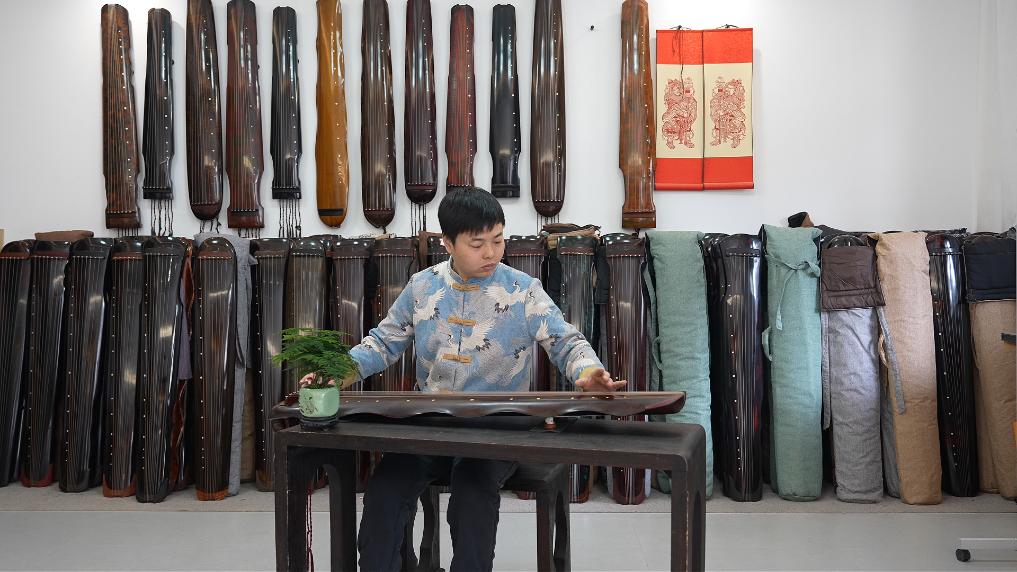 图为2026年2月3日拍摄的兰考县堌阳镇徐场村制琴师徐亚冲在弹奏古琴。新华社记者 杨静 摄