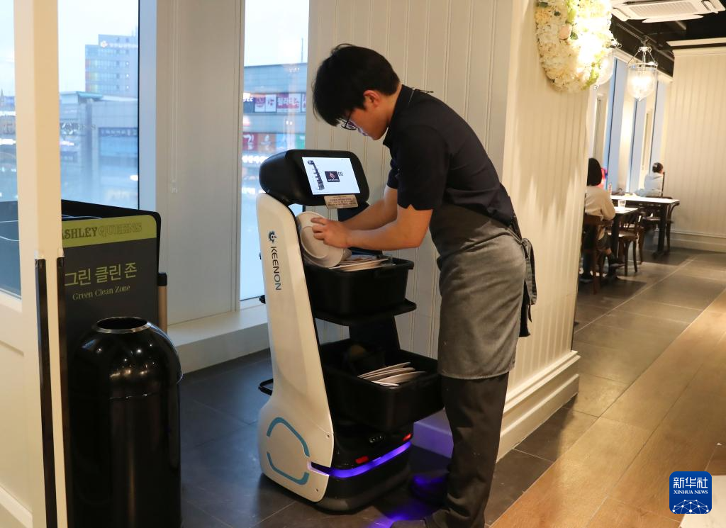 韩国首都首尔一家连锁自助餐厅内,中国制造的服务机器人来回穿梭。顾客按下桌面的呼叫铃,机器人便会及时到桌边回收餐盘并运送归位,让餐厅运转更顺畅。