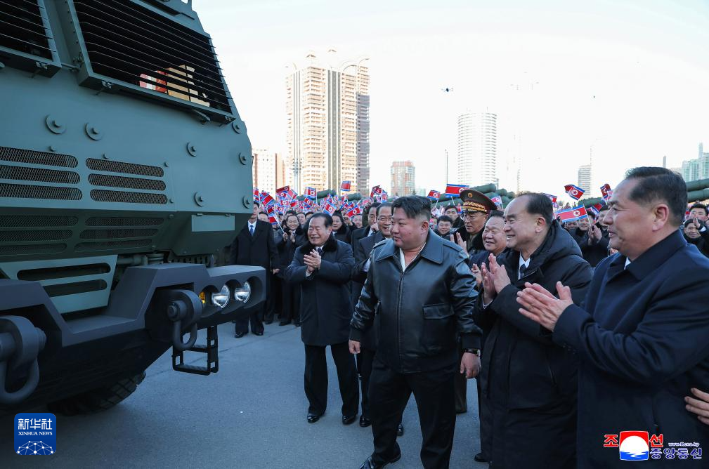 报道说,仪式在平壤“四·二五”文化会馆广场举行,军工部门赠送了增产的50门600毫米大口径火箭炮。金正恩驾驶火箭炮车,在广场上进行检阅。
