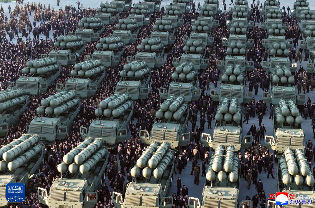 这是2月18日在朝鲜平壤拍摄的火箭炮赠送仪式现场。新华社/朝中社
