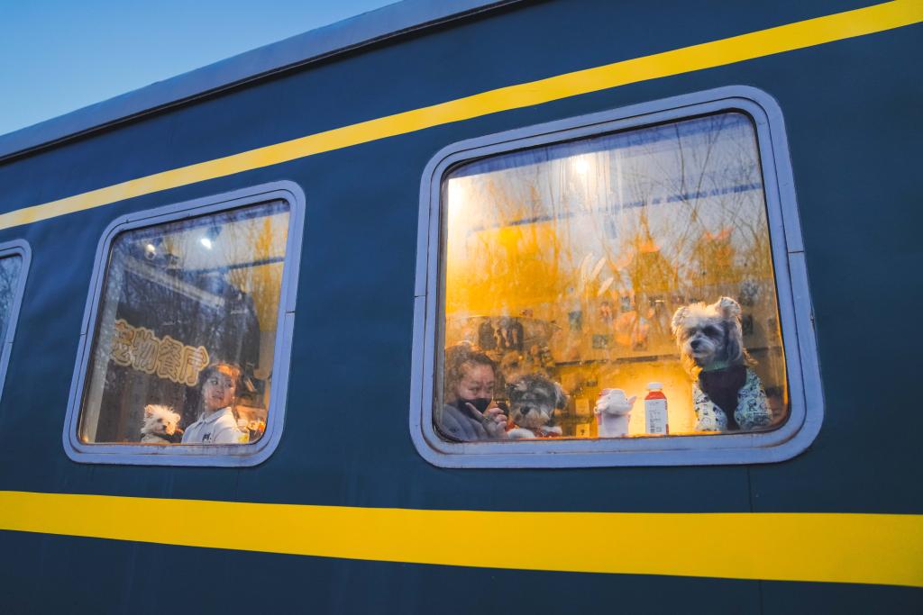 2026年2月3日,在吉林省长春市一家火车车厢主题的宠物餐厅,几只宠物狗坐在窗边等待“宠物年夜饭”。新华社记者 许畅 摄