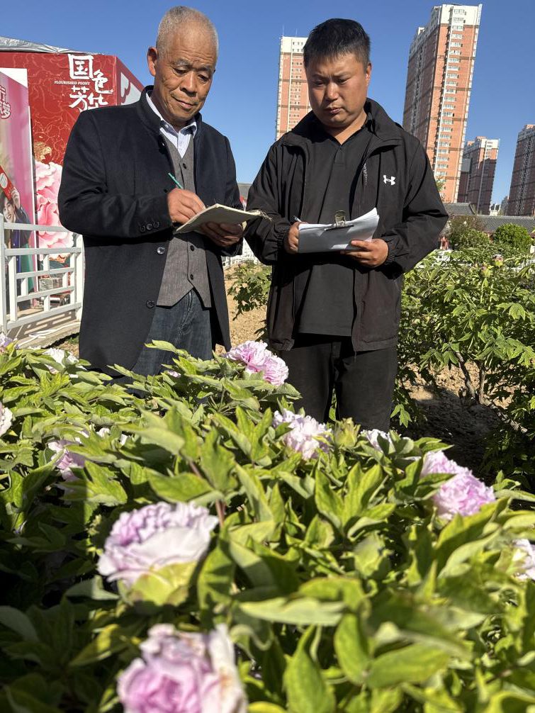 2025年4月12日,孙帅与大伯孙文海在牡丹园登记牡丹品种。受访者供图