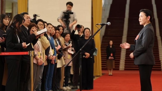 3月12日,第十四届全国人民代表大会第四次会议第三场“部长通道”集中采访活动在北京人民大会堂举行。这是司法部部长贺荣接受媒体采访。新华社记者 金立旺 摄
