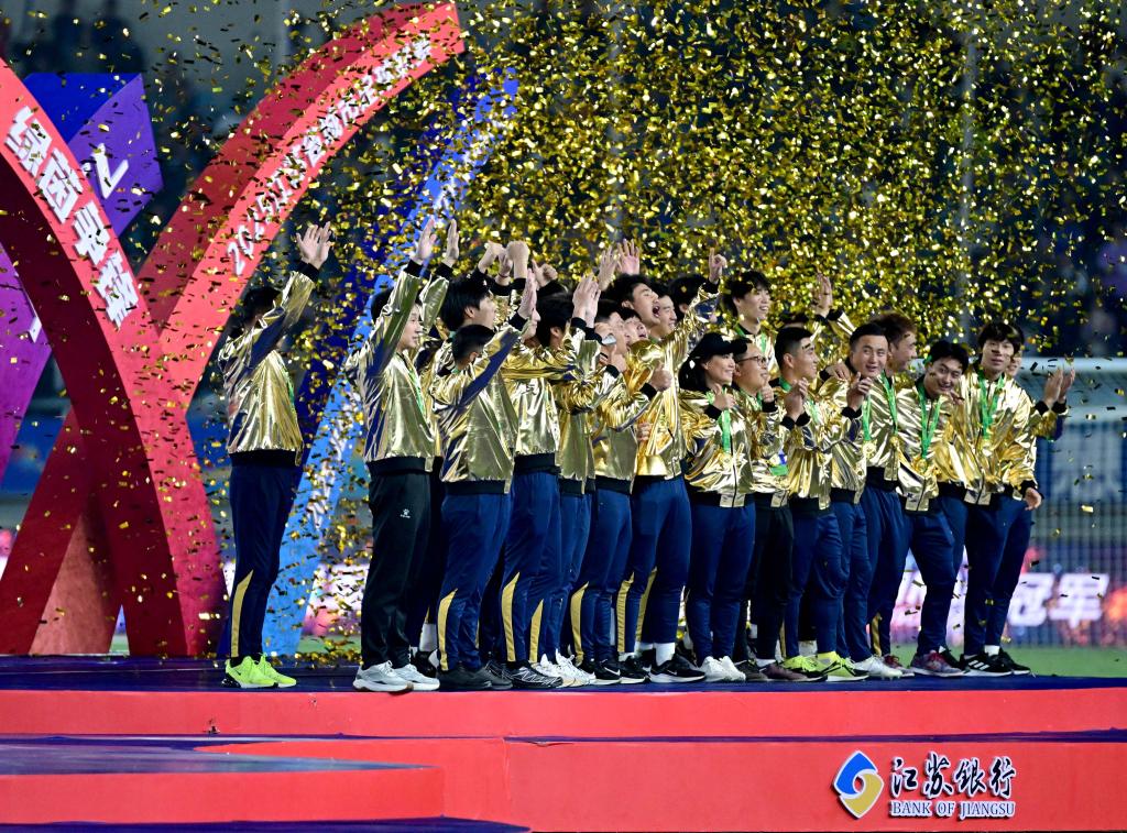 2025年11月1日,“苏超”冠军泰州队在颁奖仪式上庆祝。新华社发(曹政 摄)