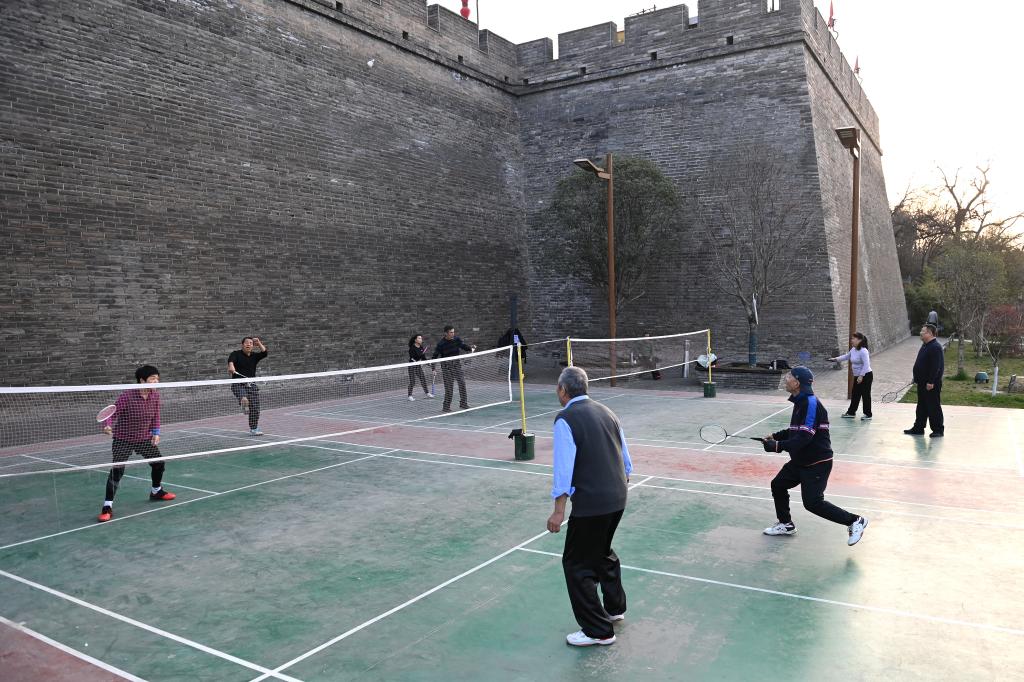 3月20日,市民在西安城墙环城公园文昌门至和平门段打羽毛球。新华社记者 李一博 摄