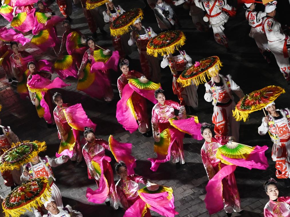 演员在榆林老街非遗大集开集仪式上表演秧歌腰鼓。(2023年2月17日摄) 新华社记者 邹竞一 摄