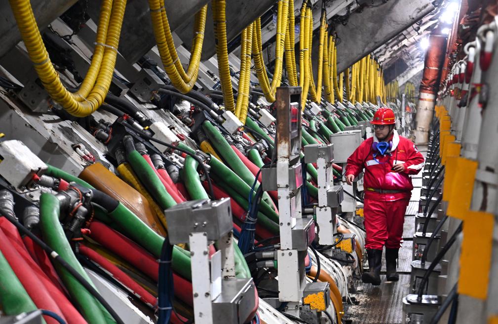 工作人员在陕西陕煤曹家滩矿业有限公司全自动液压支架支撑的采煤工作面巡检。(2024年2月29日摄) 新华社记者 邹竞一 摄