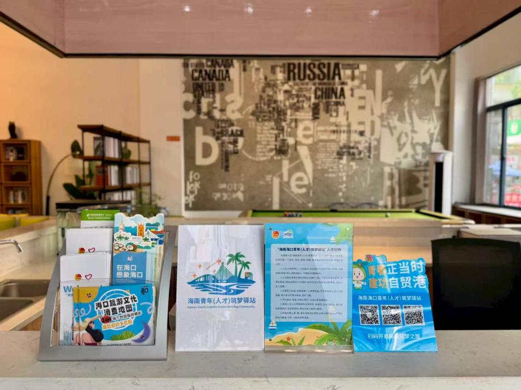 在海南省海口市的“生生汇寓”公寓驿站前台,入住公约、求职信息和城市推介等宣传单页供入住青年选用。(受访者供图)